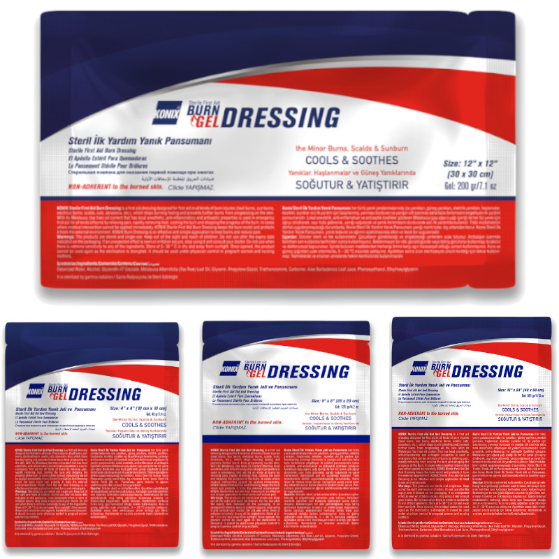 Konix® Burn Dressing si Burn Gel - ideal pentru truse de prim ajutor, ambulante, spitale, clinici, scoli, fabrici sau uz personal, ofera protectie si confort imediat în caz de arsuri.