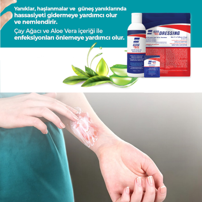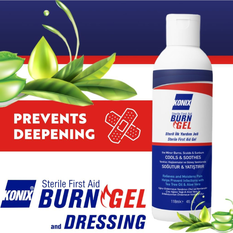 Konix® Sterile Burn Dressing si Konix® Sterile Burn Gel produse profesionale destinate acordarii primului ajutor, rapid si eficient în caz de arsuri - termice, solare, electrice, cu lichide fierbinti, taieturi sau abraziuni, acestea opresc senzatia de arsura, previn deteriorarea tesuturilor si contribuie la procesul natural de vindecare. Produsele Konix® Burn contin ulei de Melaleuca (arbore de ceai) si Aloe Vera, ingrediente recunoscute pentru proprietatile lor calmante, antiseptice si regenerante. Ofera racorire imediata zonei afectate si reduce rapid durera, potrivite pentru sugari, copii si adulti.