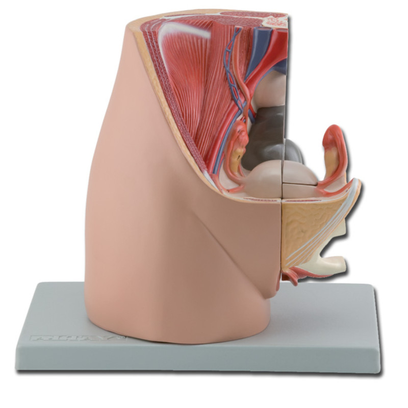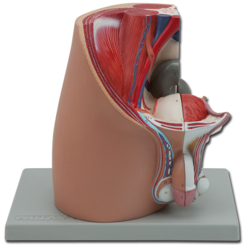 Model pelvis masculin, anatomie si fiziologie, marime naturala, 4 parti detasabile. Pelvisul masculin prezinta o vedere deschisa printr-o sectiune sagitala mediana a bazinului. Structurile interne ale sistemului urogenital masculin sunt reprezentate în detaliu. Partile detasabile includ jumatate de penis împartit în sectiuni mediale si transversale si jumatate a sistemului reproductiv masculin cu o disectie deschisa a testiculului, care prezinta detalii despre structura interna.
