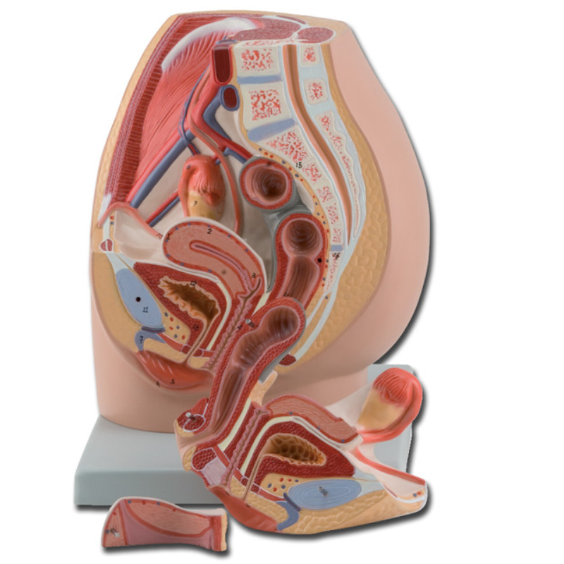 Model pelvis feminin, anatomie si fiziologie, marime naturala, 3 parti detasabile. Pelvisul feminin prezinta o disectie deschisa prin sectiunea sagitala mediana a bazinului. Structurile interne ale sistemului urogenital feminin sunt prezentate în detaliu. Partile detasabile includ jumatate din sistemul reproductiv feminin, cu uterul deschis pentru a dezvalui vederi sectionale mediale si transversale.