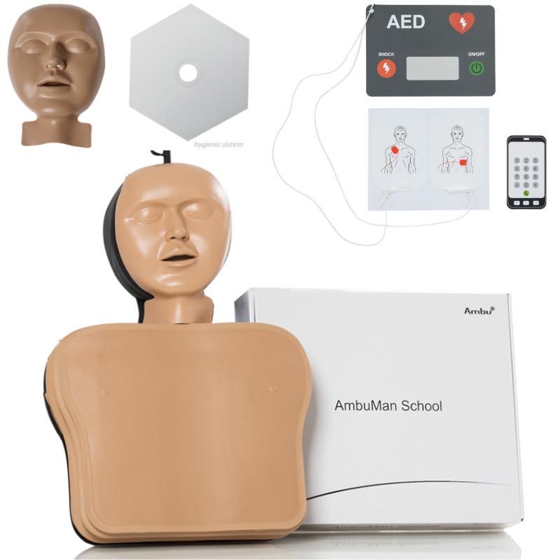 Manechin medical Ambu® Man School pentru de acordare prim ajutor si efectuarea manevrelor de resuscitare cardio-respiratorie. Manechin Ambu® Man School de instruire pentru educatie in scoala si invatarea tuturor procedurilor de resuscitare de baza pentru sprijinului vietii.