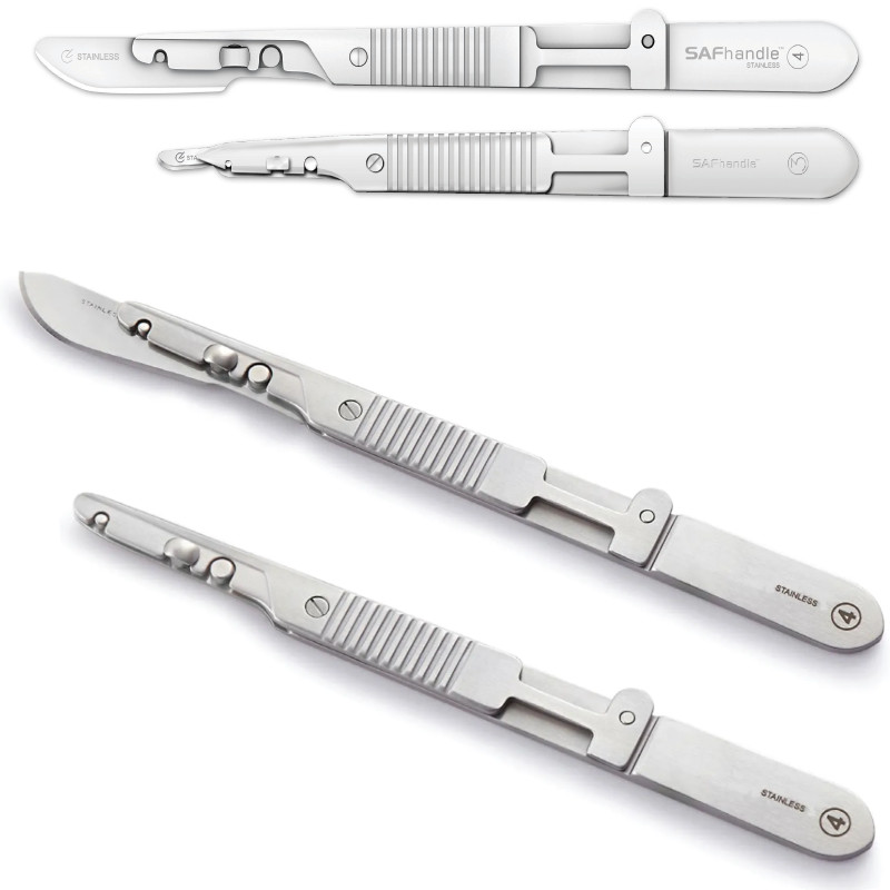 Maner bisturiu reutilizabil SAFhandle™, precizie, control si protectie maxima în timpul interventiilor chirurgicale. Bisturie medicale profesionale SAFhandle™, ergonomice cu sisteme care faciliteaza manipularea in siguranta lamelor de bisturiu, reducand riscul de întepare/taiere accidentala. SAFhandle™ linie manere de bisturiu din otel inoxidabil german de calitate superioara:
