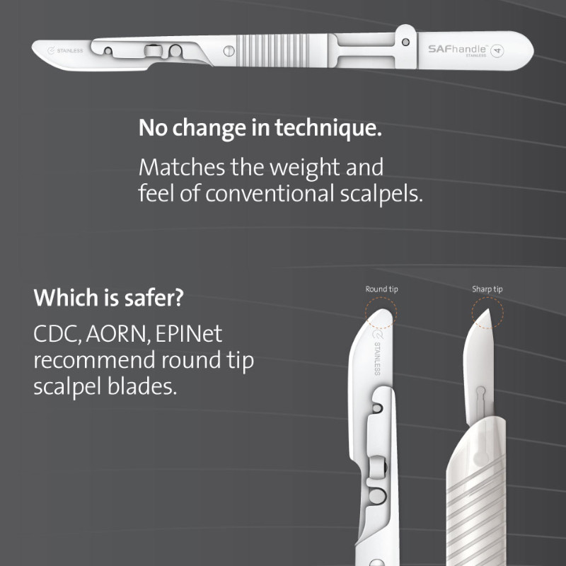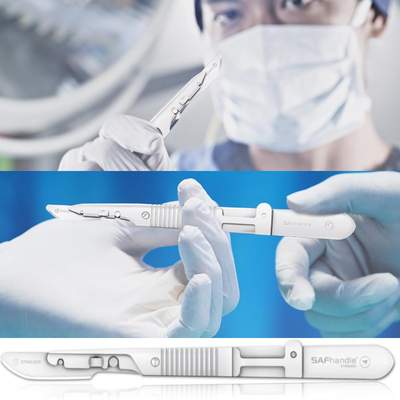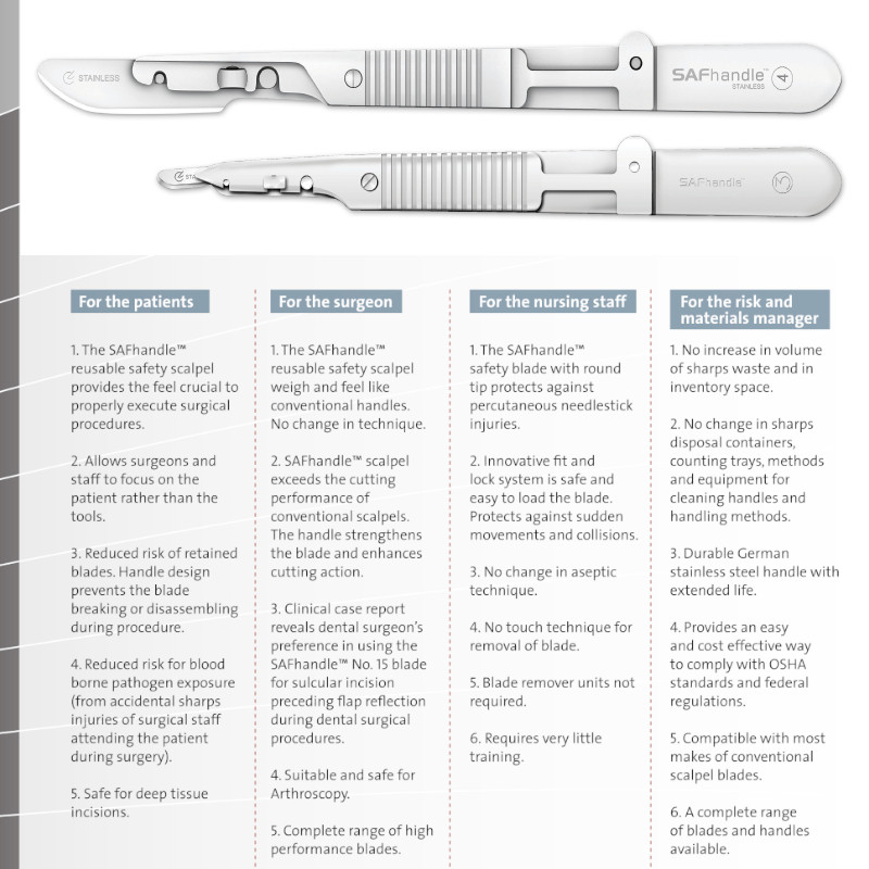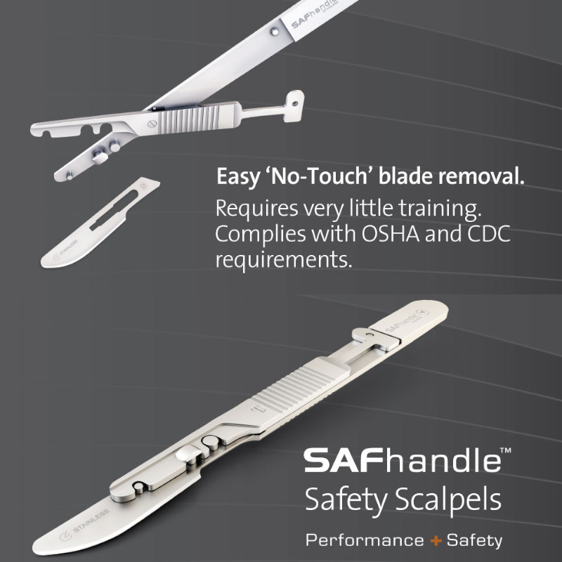 Maner bisturiu chirurgical SAFhandle™ designul inteligent ofera chirurgilor ergonomie, greutate si echilibru, integreaza un sistem modern de siguranta „no-touch”, care elimina contactul direct cu lama de bisturiu în timpul îndepartarii, conform cerintelor internationale OSHA si CDC.