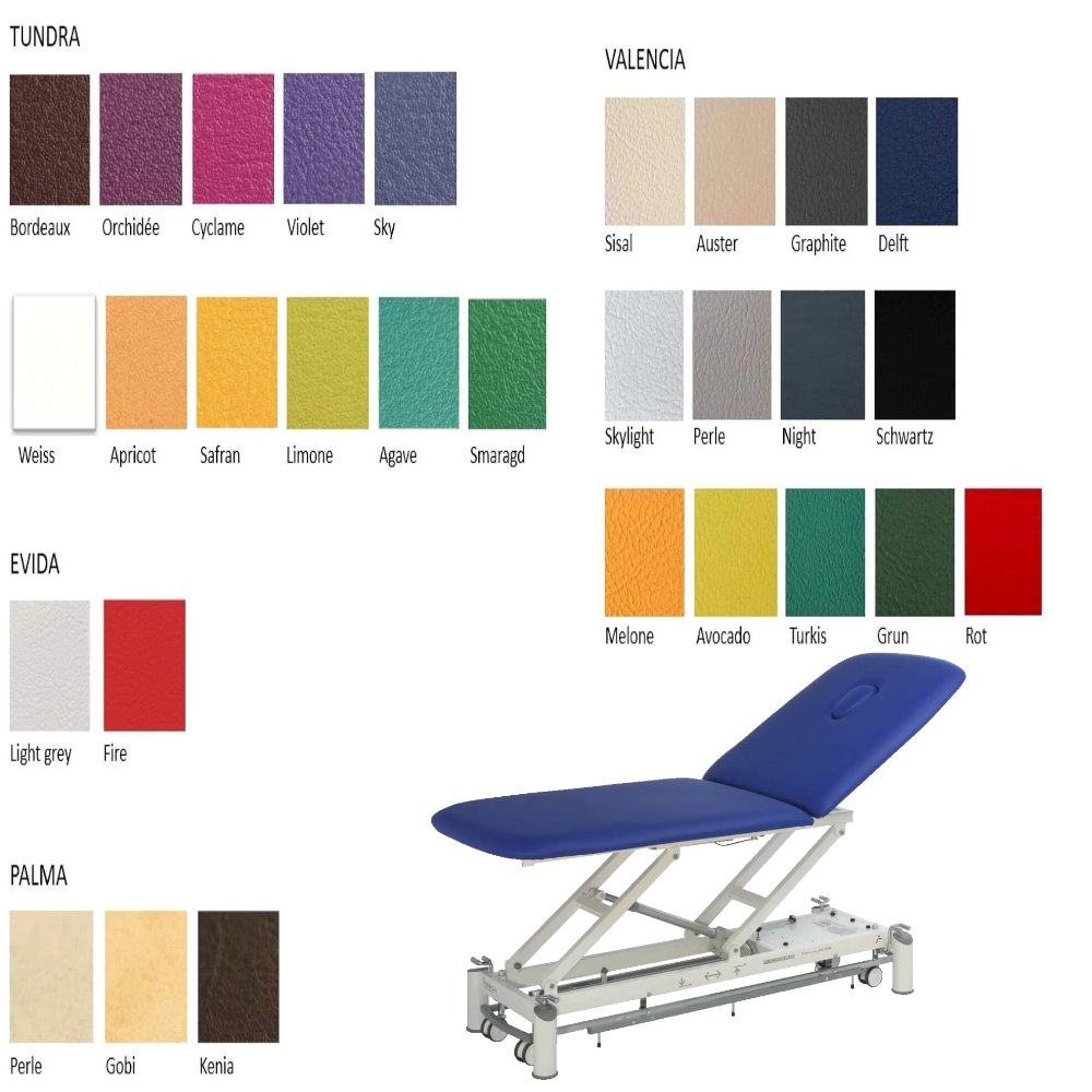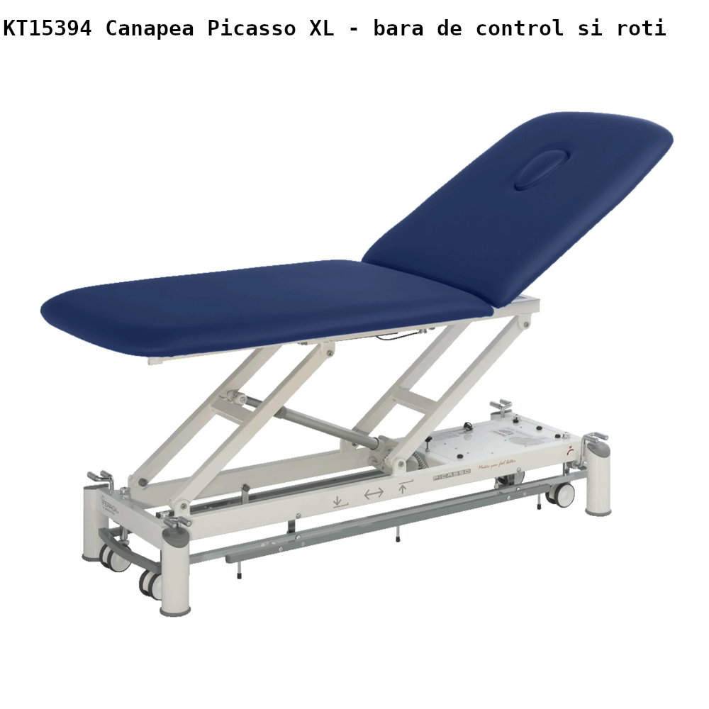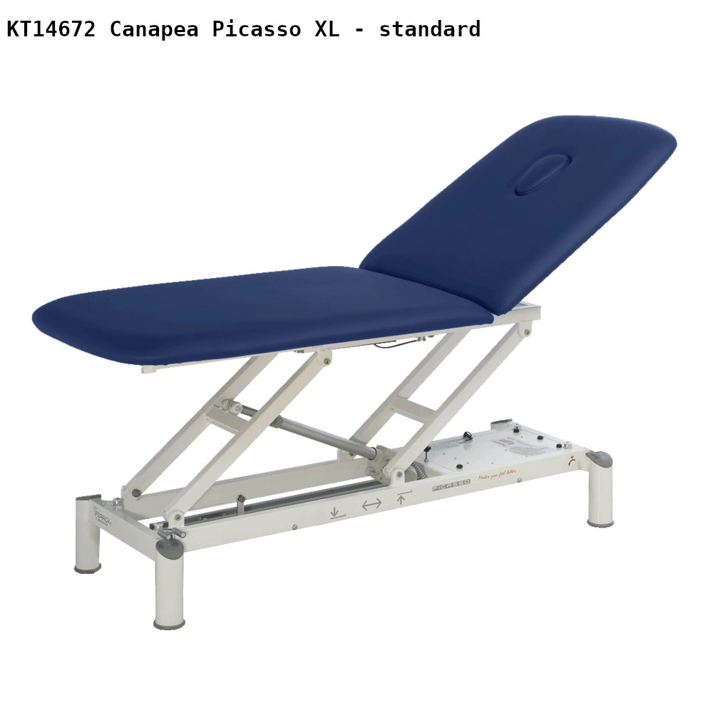 Canapea electrica kinetoterapie Picasso XL echipata cu panou de comanda cu butoane si sistem de blocare de siguranta pentru controlul înaltimii, sporind protectia în timpul utilizarii. Tapiteria si umplutura sunt realizate din materiale ignifuge clasa 1IM, rezistente si usor de întretinut, conforme cu cerintele mediului medical, disponibila într-o gama variata de culori