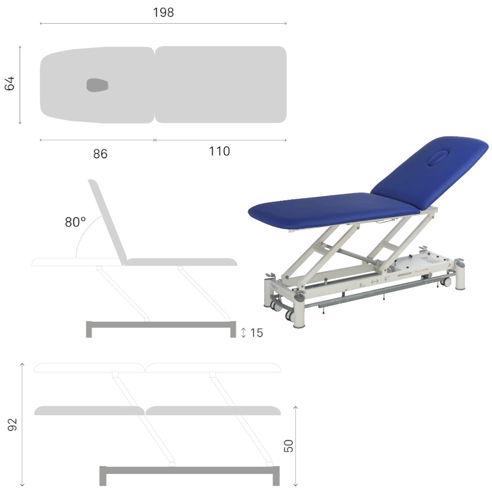 Masa masaj profesionala Picasso XL cu 2 sectiuni – reglaj electric pe înaltime si spatar rabatabil. Canapea electrica de masaj si fizioterapie pentru utilizare profesionala în cabinete de kinetoterapie si recuperare medicala, spitale, clinici si centre de reabilitare. Masa medicala Picasso XL, design ergonomic si functionalitati avansate, ideala pentru sedinte de terapie, masaj si examinari medicale, asigurand confort pacientului si terapeutului.