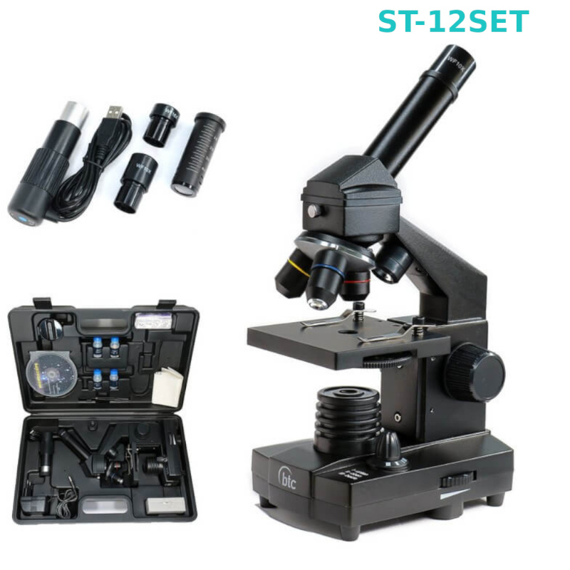 - ST-12SET Set microscop biologic Student® 12 cu camera: in loc de ocularul putem conecta si camera CCD pentru microscoape (contine pachetul), astfel observatiile pot fi înregistrate pe un laptop sau pe calculator.
