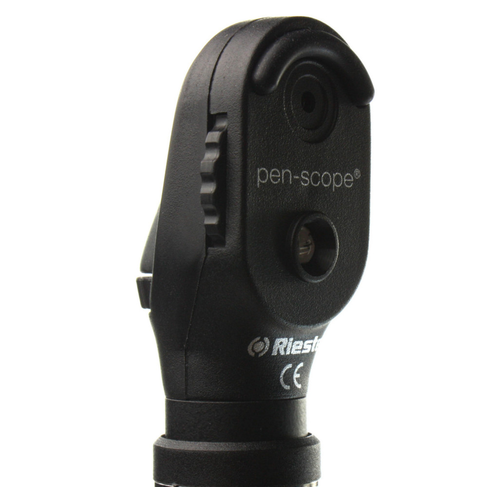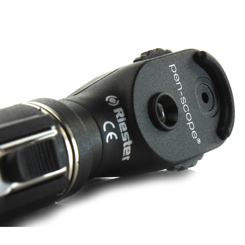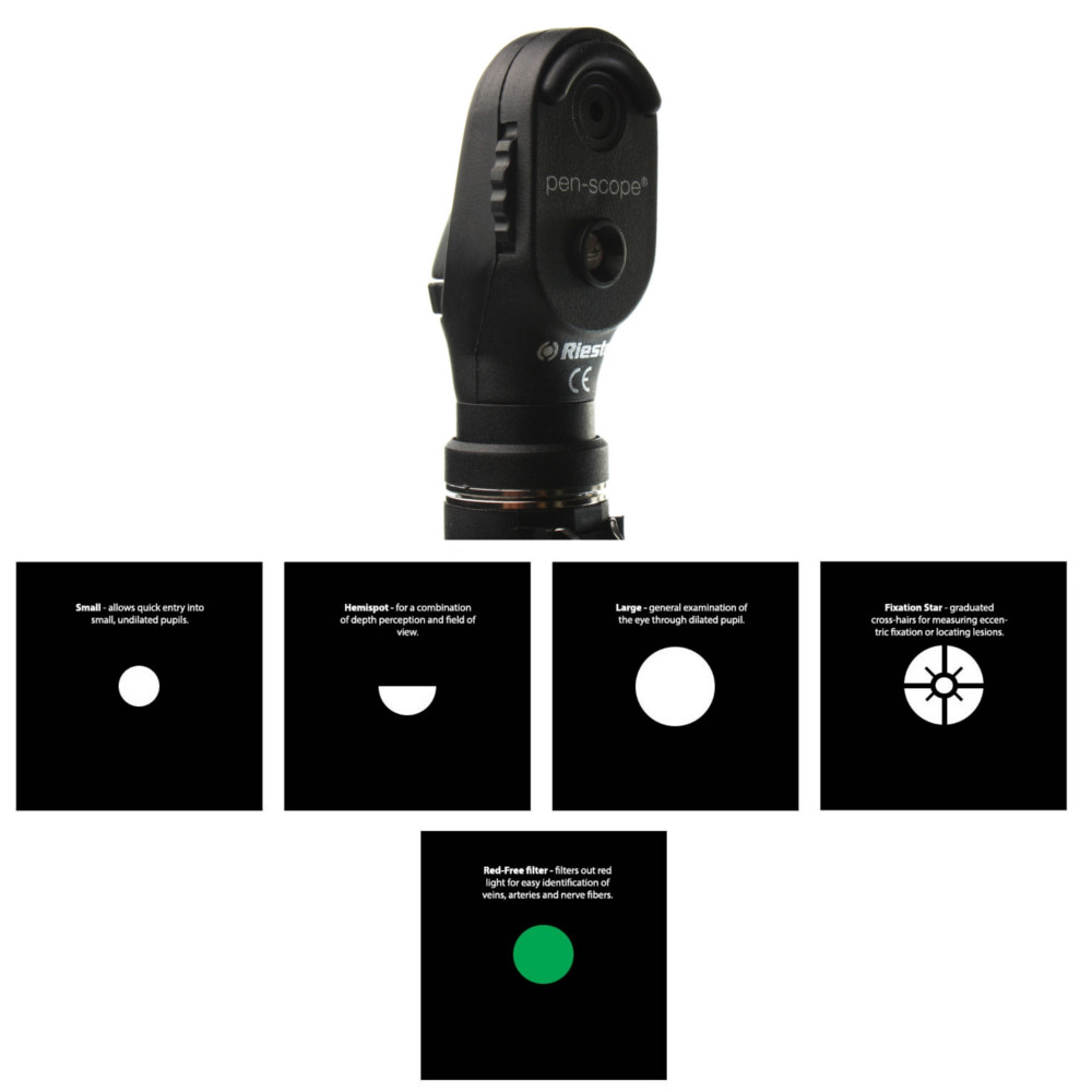 Oftalmoscop Riester pen-scope®, bec halogen HL 2.5V, dioptrii de la -20 la + 20, cerc mic, cerc mare, fanta, semicerc, cerc diagrama, carcasa din plastic ranforsat, inele de metal cromat, tratate anticoroziune.