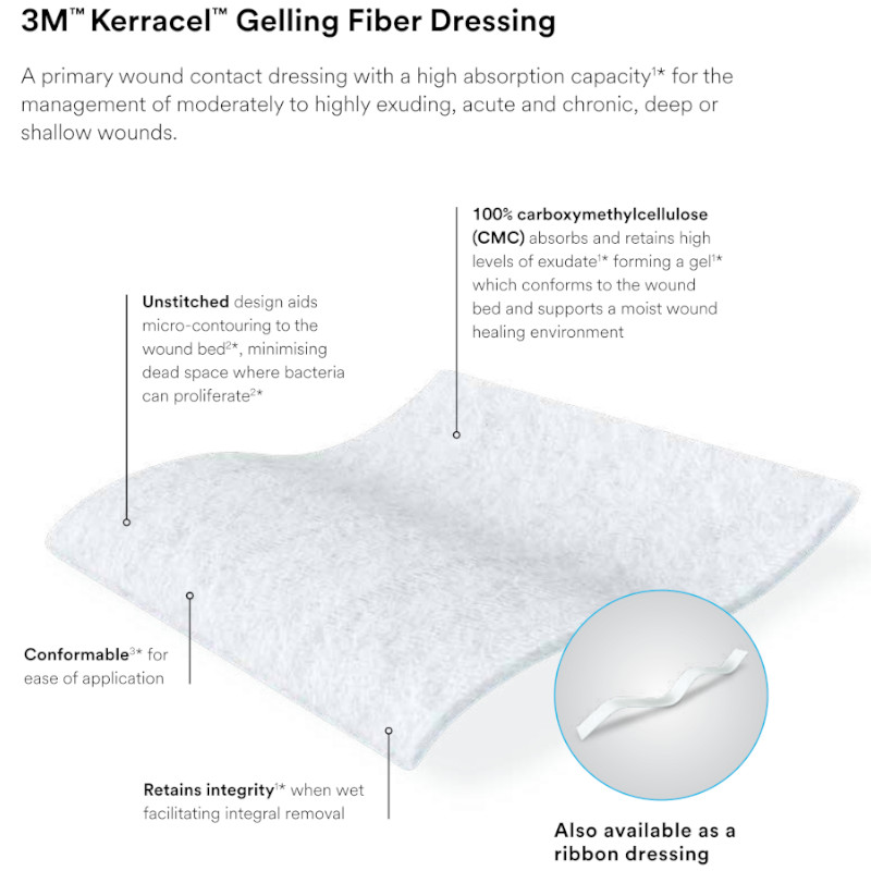 Pansamentul 3M™ Kerracel Gelling Fibre Dressing este un pansament primar versatil, realizat din 100% fibre de carboximetilceluloza (CMC), conceput pentru tratamentul ranilor cu exsudat moderat. La contactul cu secretiile plagii, fibrele CMC formeaza un gel moale si conformabil, care se muleaza perfect pe patul plagii, mentinand un mediu umed optim pentru vindecare.