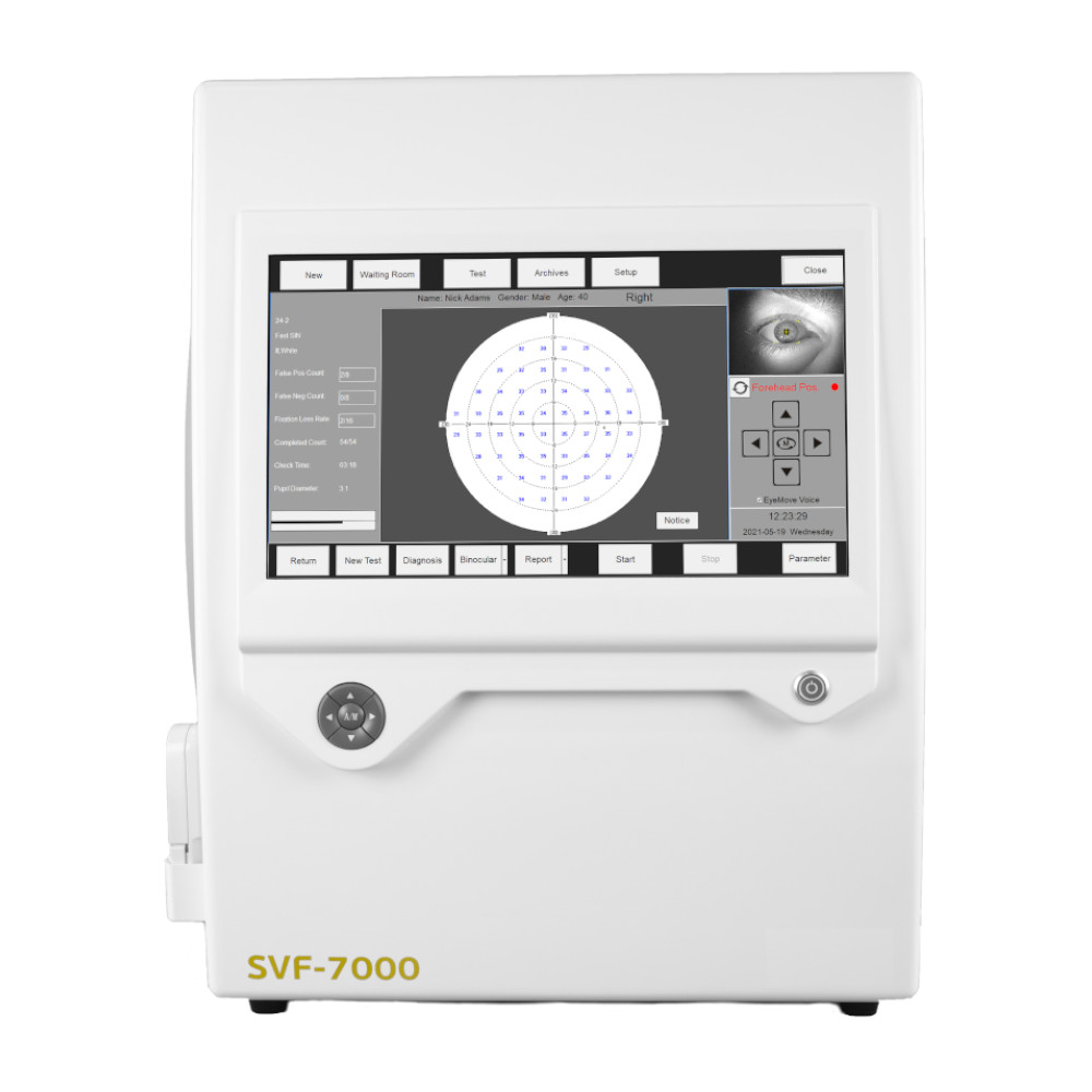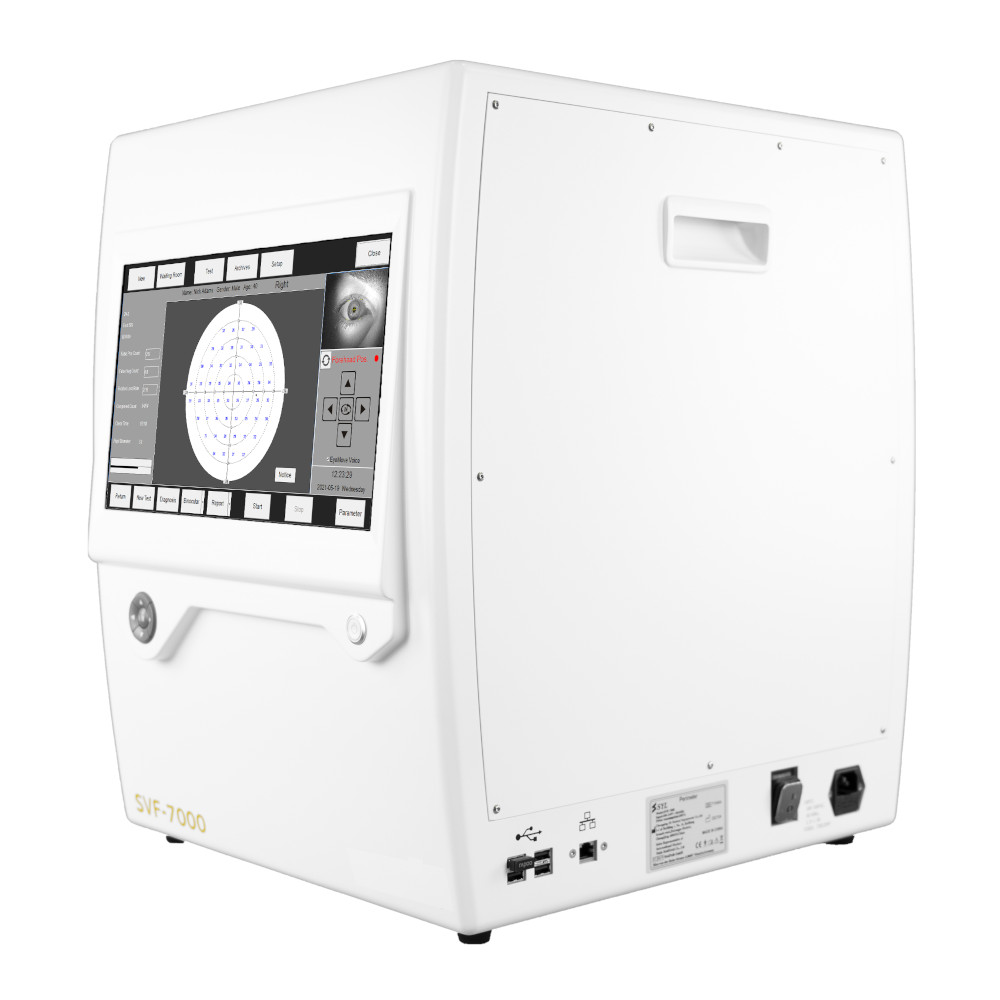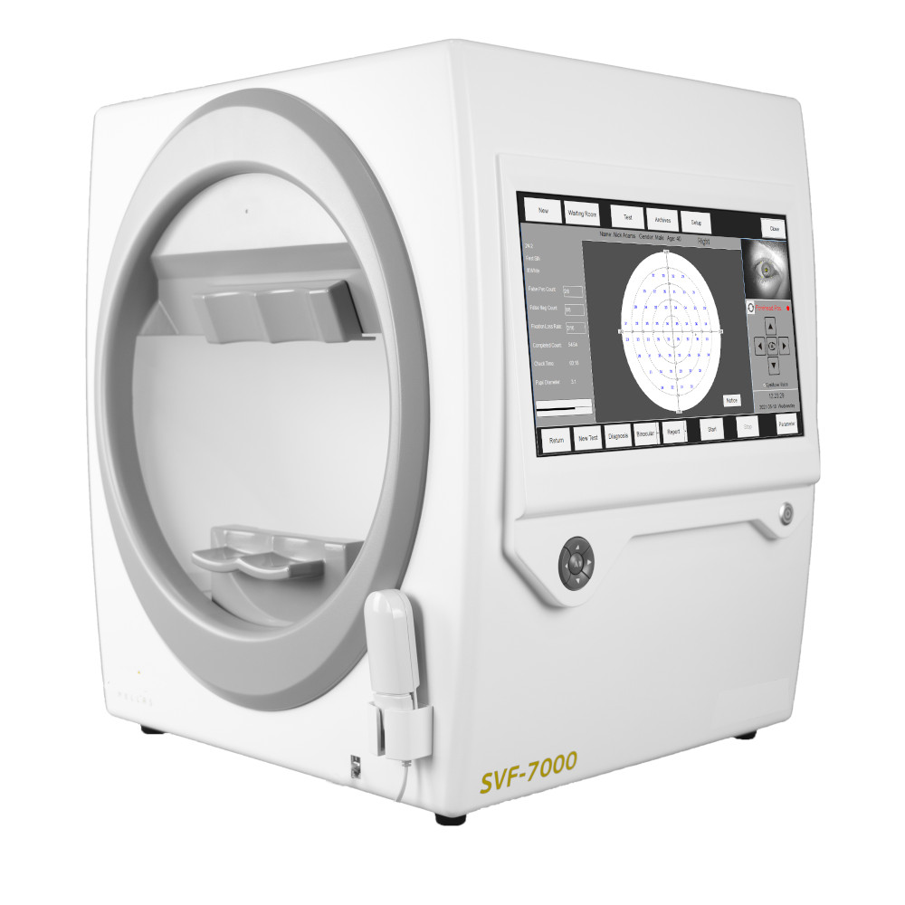 Perimetru computerizat SVF-7000 aparat oftalmologic pentru diagnostic retinal, masurare precisa si rapida a suprafetei acoperite de campul vizual al ochiului. Perimetru oftalmologic SVF-7000 permite medicului oftalmolog, detectarea si evaluarea patologiilor care determina constrictia vederii periferice, dezlipire de retina, retinita pigmentara. Perimetru computerizat SVF-7000, monitor LCD 14" touch screen, PC - RAM 4GB, Hard disk 120 GB, windows 10.