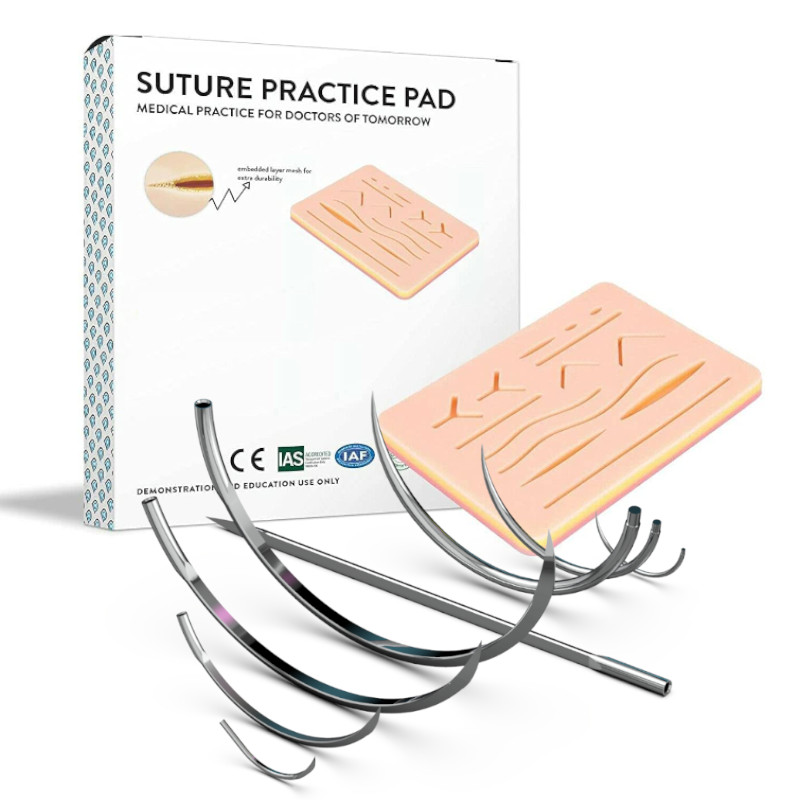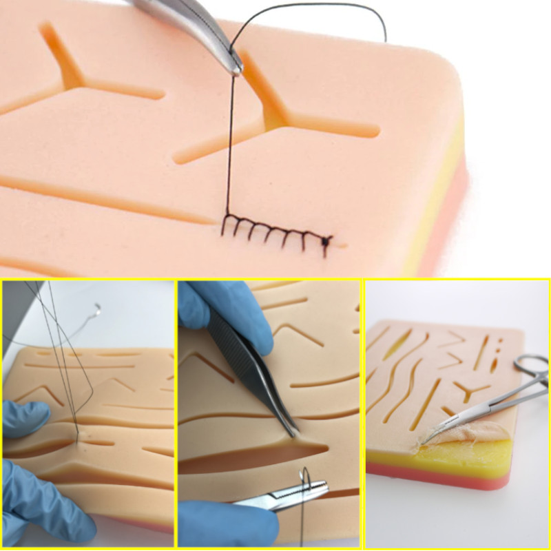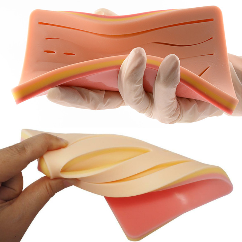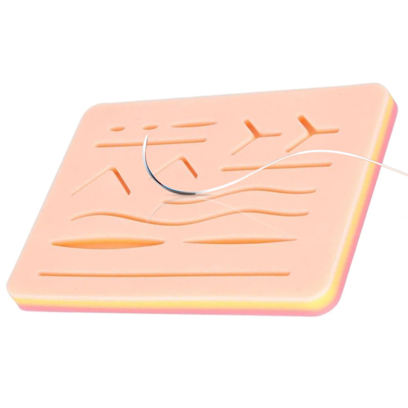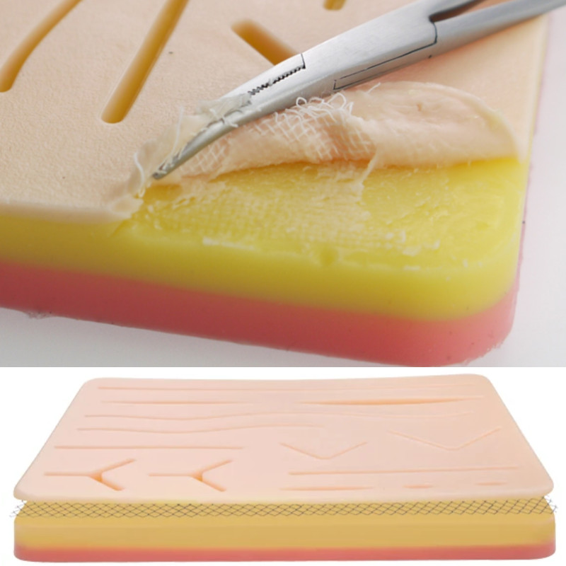 Pad sutura din silicon cu 14 plagi, 3 straturi: piele, subcutanat, muschi (strat suplimentar plasa sub piele), rezistenta sporita, textura naturala, imitare perfecta a procesului de suturare. Dimensiuni: 17,2 x 12 x 1,2 cm.