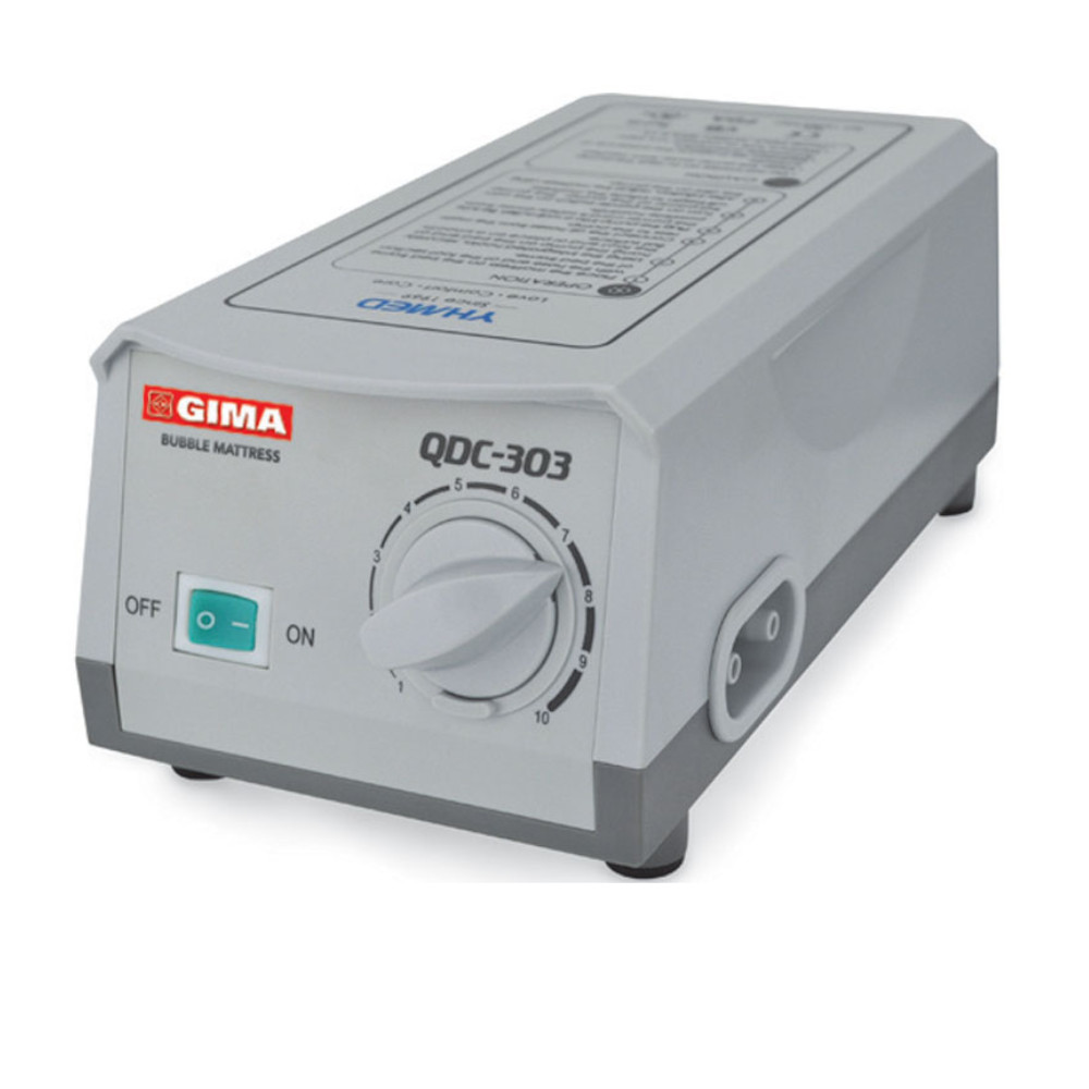 Compresor QDC-303, pompa speciala silentioasa pentru o reglare excelenta a presiunii, buton pornire pe panoul frontal. Poate fi agatat de orice tip de cadru de pat de spital prin intermediul a doua carlige reglabile.