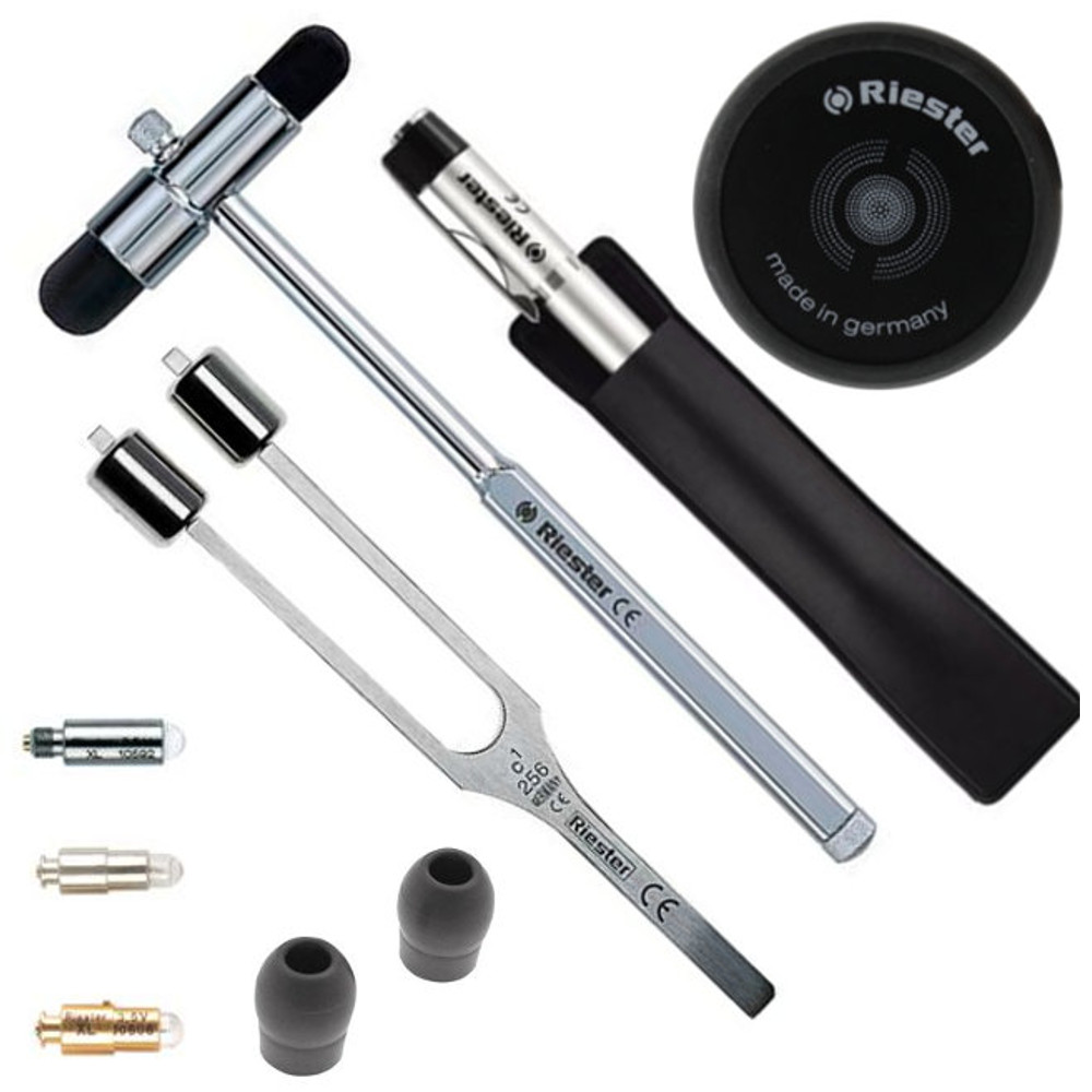 Otoscop ri-scope® F.O. L - iluminare prin fibra optica, lupa x3 rotativa, permite utilizarea instrumentelor chirurgicale, lupa mica x4 cu brat pivotant. Otoscopul ri-scope® L, iluminare cu bec Xenon XL de 3.5V (3500 Kelvin), lupa rotativa cu marire x3, sistem pentru efectuarea otoscopiilor pneumatice.