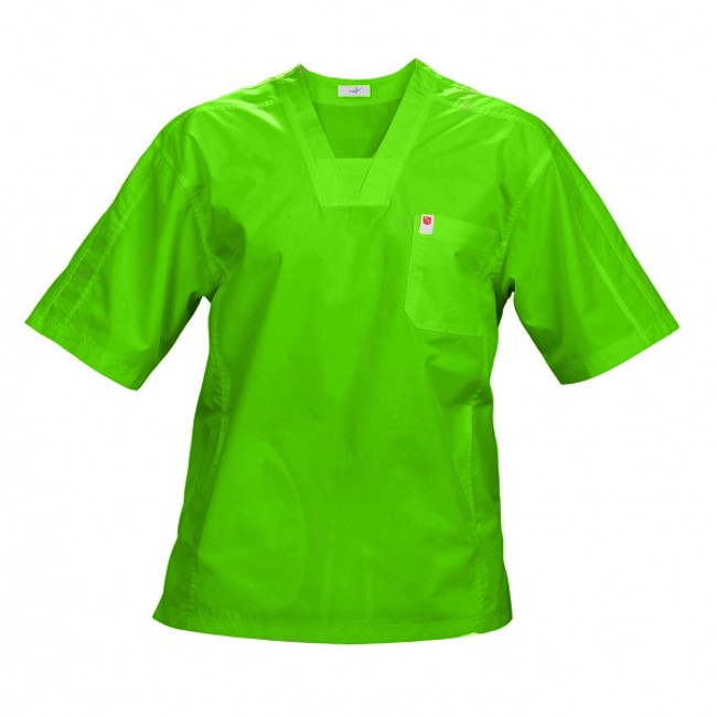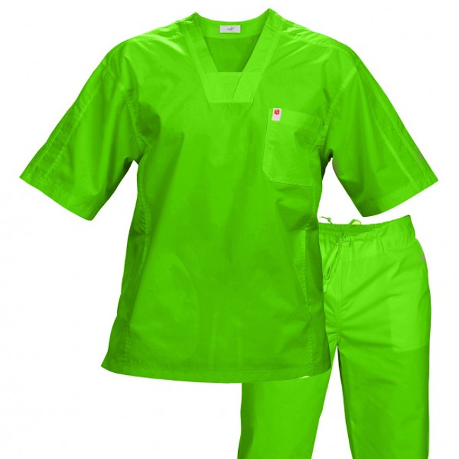 Costum medical pentru barbati, stil sport, culoare verde lime, cusaturi duble ornamentale. Uniforme medicale material cu textura placuta la atingere, nu se sifoneaza. Bluza medicala cu maneca scurta, croiala dreapta, 2 buzunare interioare, 1 buzunar aplicat in partea superioara. Pantalon medic, croiala dreapta, doua buzunare interioare, banda elastica de 4 cm la spate, snur fata. Marimi uniforma medicala: XS, S, M, L, XL, XXL, material: poplin slefuit - PES 60%, BBC 40%, 130g/m2, temperatura de spalare - alb 60 °C, color 40 °C