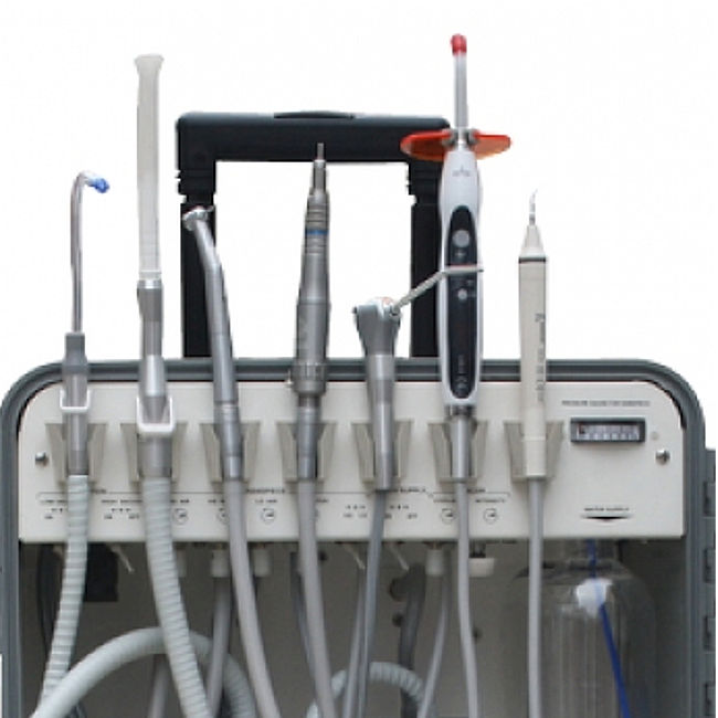 Unit stomatologic portabil cu 7 terminale, destinat pentru utilizarea in practica medical, atat in conditii de stationar cat si pentru vizite la domiciliu sau chemari de urgenta.